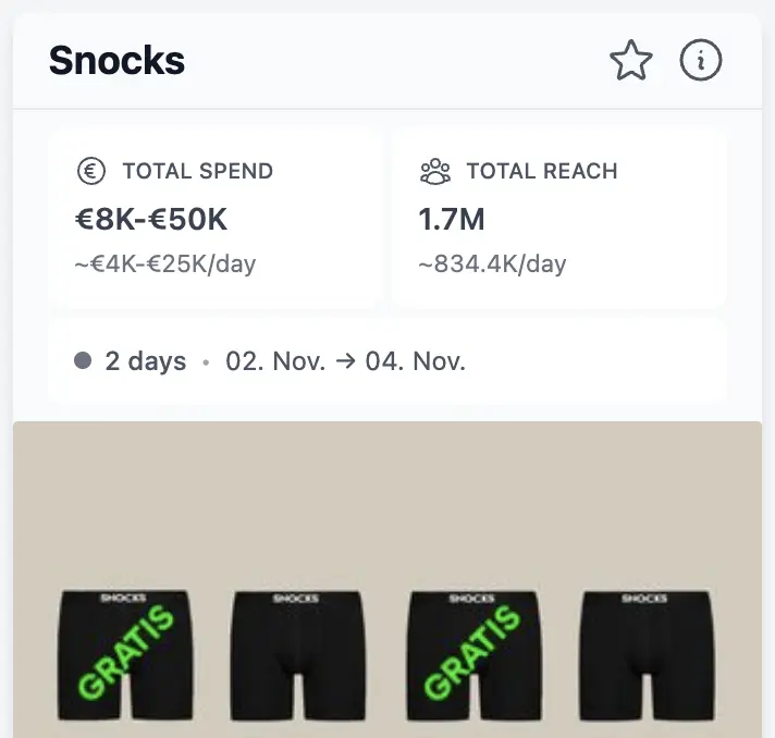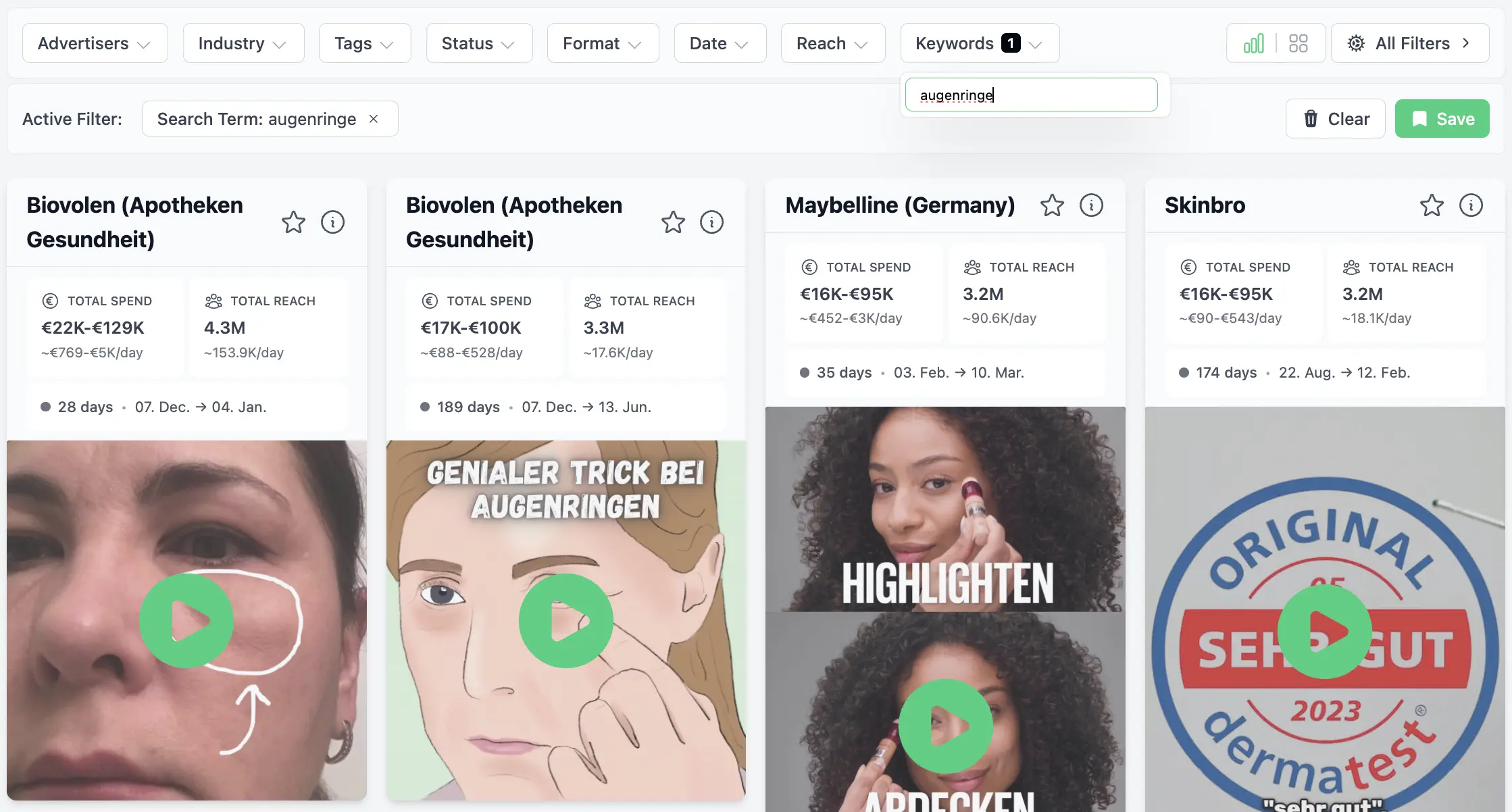 Suche, filtere und sortiere Advertiser nach Ad Spend, Ads started, Ads active, um die besten Advertiser im gesamten Markt oder deiner Branchen zu finden (inkl. top Landing Pages).